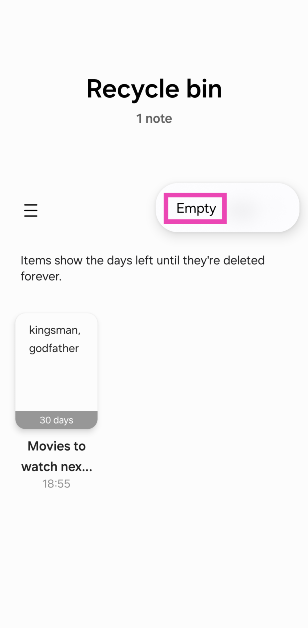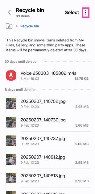 Samsung -puhelimen alkuperäiset sovellukset on integroitu poistettujen tiedostojen kierrätysastiaan. Nämä sovellukset sisältävät tiedostoni, gallerian, kalenterini, yhteystiedot, äänitallennin ja muut. Kun olet poistanut tiedoston Samsung -puhelimesta, se siirretään kierrätysastiaan, missä se pysyy 30 päivää ennen pysyvää deleetiota. Jos yrität vapauttaa säilytystilaa Samsung -puhelimellasi, tässä voit tyhjentää kaiken sisällön kierrätysastia.