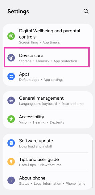 Vaihe 1:Mennä jhkAsetuksetja valitseLaitehoito.