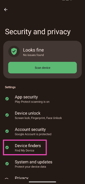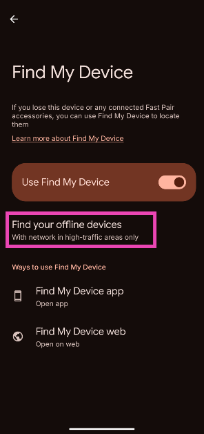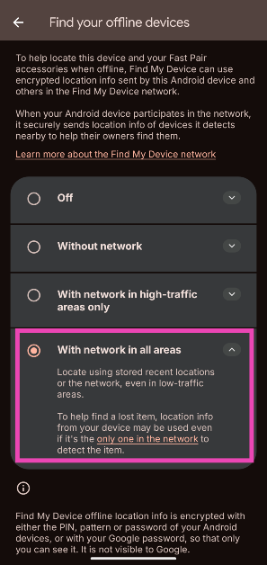 Mene Android -älypuhelimellasiAsetukset> Suojaus ja yksityisyys> Laitealueet> Etsi laitteeni> Etsi offline -laitteetja valitse 'verkon kanssa kaikilla alueilla ”.