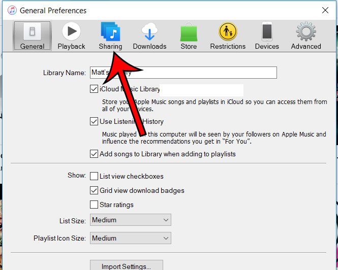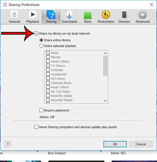 Vaihe 4: Valitse vasemmalla puolella oleva ruutuJaa kirjastoni paikallisessa verkossa. Huomaa, että voit myös määrittää, mitkä soittolistat jaetaan, sekä luoda salasanan ja päättää, muutokset leikkimuutoksista. Kun olet valmis, napsautaHyväPainike ikkunan alareunassa.