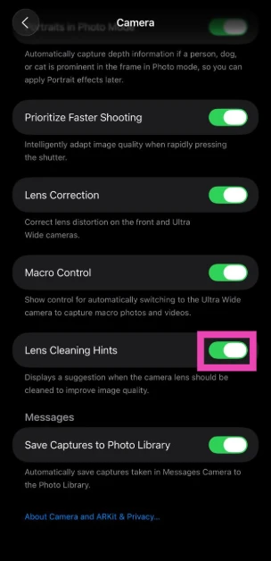 Siirry osoitteeseenAsetukset> Kameraja käännä linssin puhdistusvinkit -kohdan vieressä oleva vaihtokytkin päälle. Tämä ominaisuus on käytettävissä vainiOS 26.