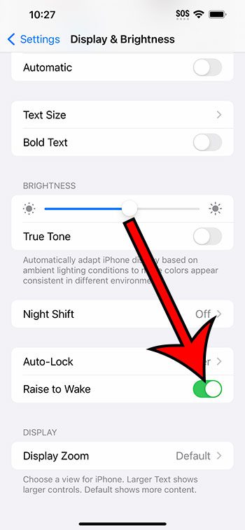 Voit kääntää korotuksen herätysasetukseen tai pois päältä iPhone 14: llä menemälläAsetukset> Näyttö ja kirkkaus>napauta sitten painiketta vieressäNostaa.