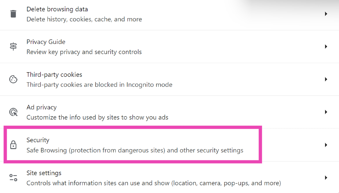 Siirry Chrome -asetuksiin, valitseTietosuoja ja turvallisuus> Turvallisuusja napsauta 'Parannetun suojauksen' alla 'turvallinen selaus'.