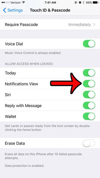 Vaihe 4: Vieritä alasAnna pääsy lukittunaValikon osio ja napauta sitten painiketta oikealla puolellaIlmoitusnäkymäkytkeä se päälle. Tiedät, että se on päällä, kun painikkeen ympärillä on vihreää varjostusta. Se on kytketty päälle alla olevassa kuvassa.