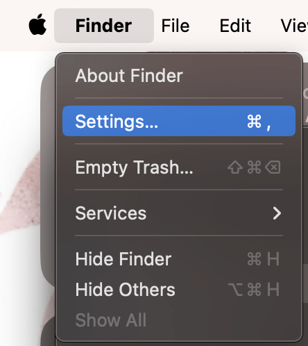 Kun Finder on auki, napsautaEtsinvalikossa jaAsetukset.