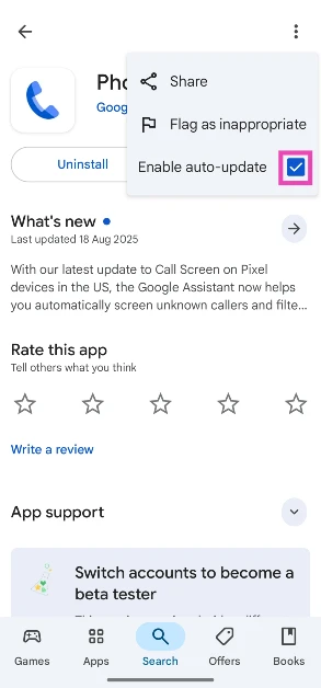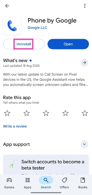 Vaikka vanhaan muotoiluun ei ole vielä siirtyä, voit palauttaa puhelinsovelluksen edellisen version poistamalla uusi päivitys. Siirry Google Play -kauppaan, etsi 'Google -puhelin', napauta tulosta ja paina 'Poista'. Varmista, että napautat ellipsit ja poista myös 'Ota käyttöön automaattinen päivitys'.