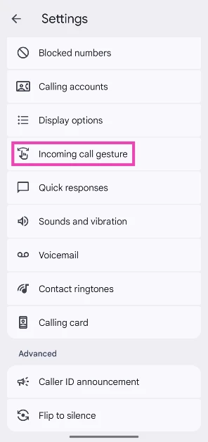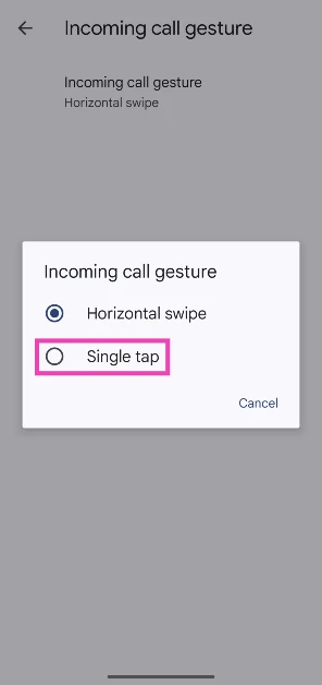 Käynnistä puhelinsovellus, napauta hampurilainen valikko, siirry osoitteeseenAsetukset> Saapuva puhelu ele, napauta 'saapuvaa puhelu elettä' ja valitse 'yksi napautus'.