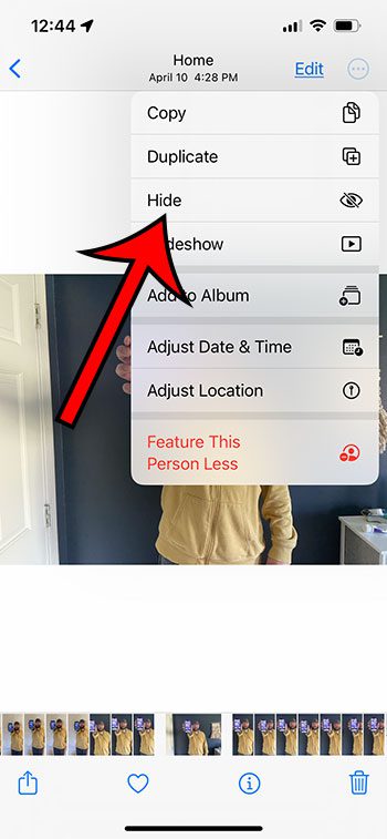 Voit piilottaa kuvan iPhone 13: lla menemälläKuvatAPP, valitsemalla kuvan, napauttamalla kolme pistettä oikeassa yläkulmassa, valitsemallaPiilottaa, sitten koskettaaPiilota valokuvapainike.