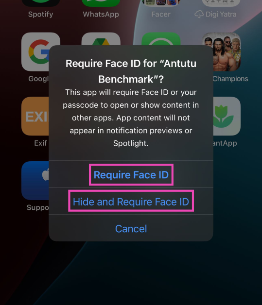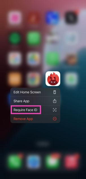 Pitkä paina sovelluksen kuvaketta aloitusnäytössä ja valitse ponnahdusvalikosta Face ID. Napauta 'Vaadi kasvotunnus' uudelleen lukitaksesi tai 'piilottaaksesi ja vaadi kasvotunnus' piilottaaksesi sen.