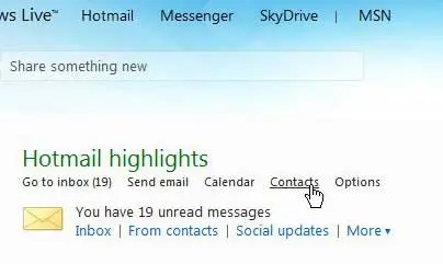Vaihe 1: Aloita avaamalla uusi selainikkuna ja siirry osoitteeseenwww.hotmail.com. Kirjoita sähköpostiosoitteesi ja salasanasi vastaaviin kenttiin ja napsauta sittenKirjautua sisäänpainike. NapsauttaaKontaktitLinkki ikkunan keskellä.
