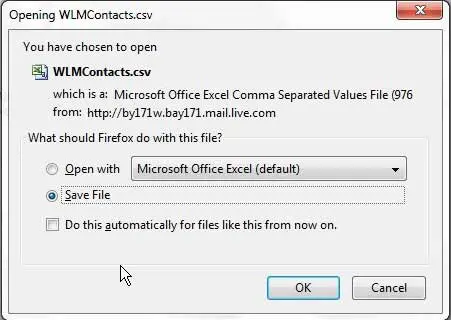 Vaihe 3: Tämä luo automaattisesti Hotmail -yhteystietojen CSV -tiedoston, joka kehottaa sinua tallentamaan tai avaamaan tiedoston tietokoneellesi. Valitse vaihtoehto tallentaa tiedosto tietokoneeseen.
