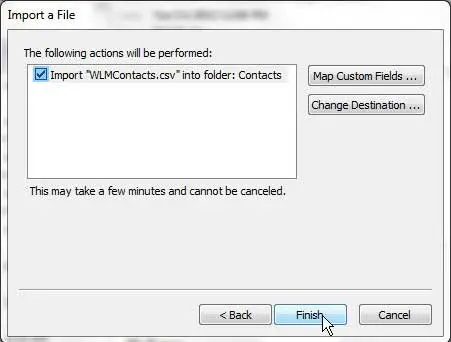Vaihe 10: NapsautaKontaktitkansioValitse kohdekansioseuraavan ikkunan osio ja napsauta sittenSeuraavapainike. NapsauttaaViimeistelyPainike tällä viimeisellä näytöllä saadaksesi päätökseen yhteystietojesi tuonti Hotmailista Outlook 2010: een.
