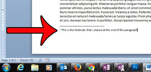 Nyt kun tiedät kuinka lisätä alaviite Word 2010 -sovellukseen, voit käyttää tätä vaihtoehtoa sisällyttääksesi lisätietoja asiakirjasivujen alaosaan.