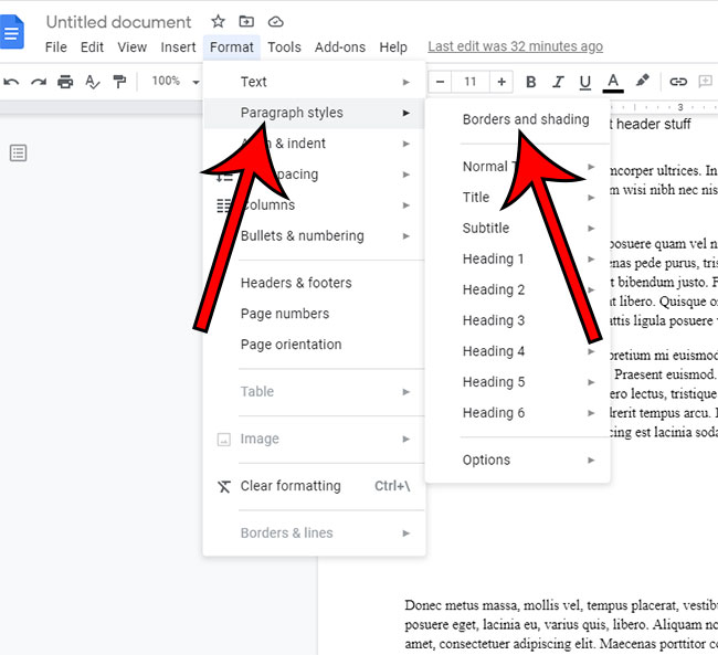 Voit lisätä rajaviivan kappaleeseen menemälläMuoto> Kappaletyylit> Rajat ja varjostusvalitsemalla sitten vasemman tai oikean reunan asetukset.