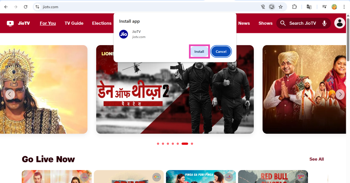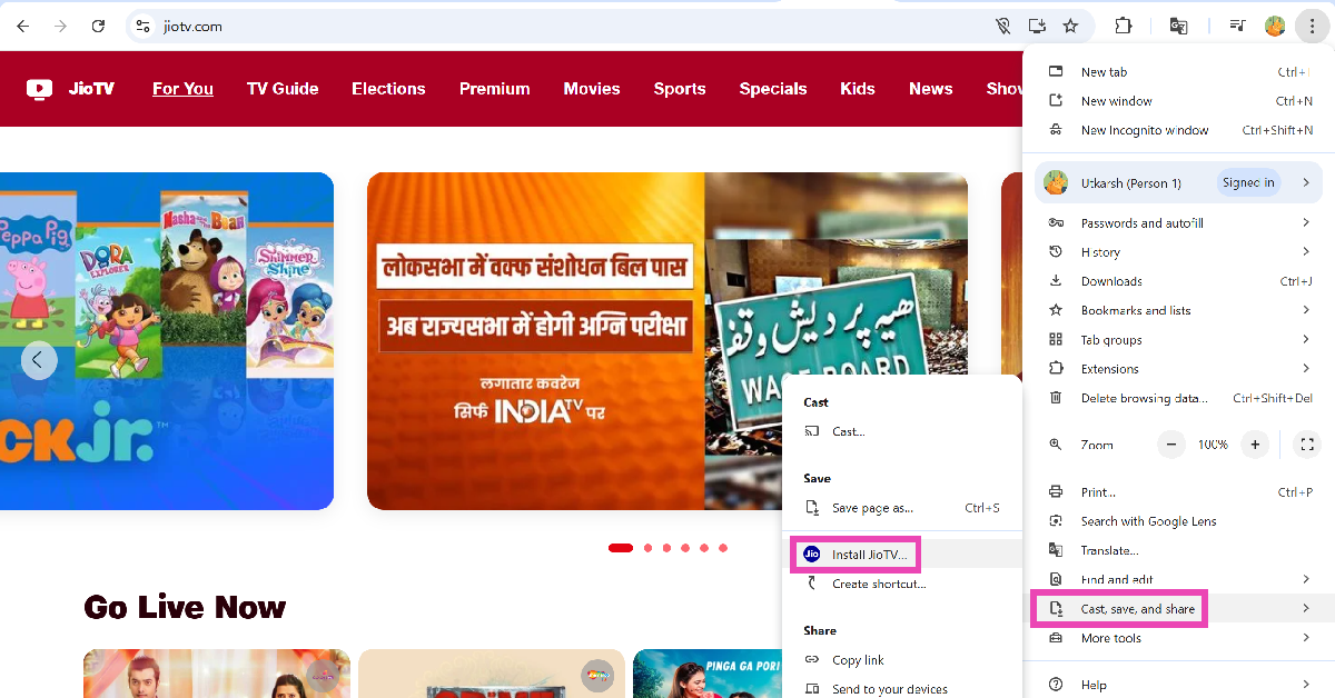 Siirry Chromeen ja avaa JIOTV -verkkosivusto. Napsauta ellipsejä, siirry kohtaan 'Näyttele, tallenna ja jaa' ja napsauta asenna jiotv.