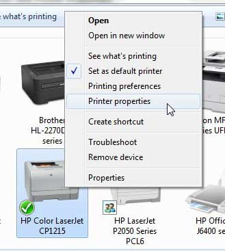 Vaihe 2: Napsauta hiiren kakkospainikkeellaHP Color Laserjet CP1215vaihtoehto ja napsauta sittenTulostimen ominaisuudet.