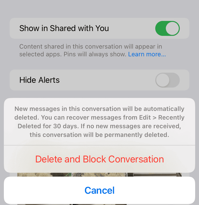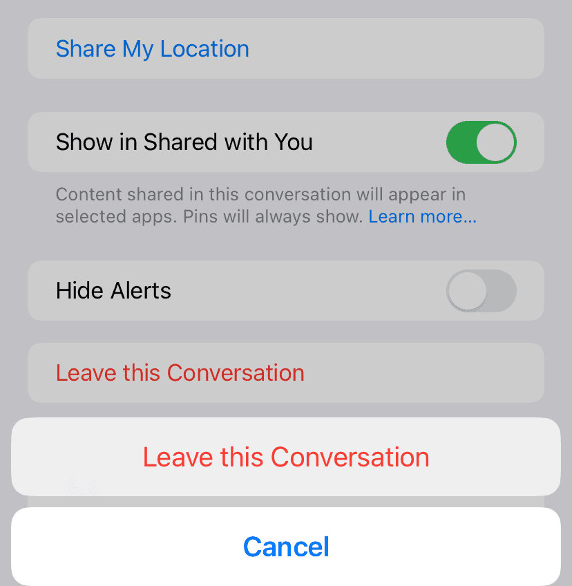 | 3. | Vieritä alas ja napauta ”Jätä tämä keskustelu”. |