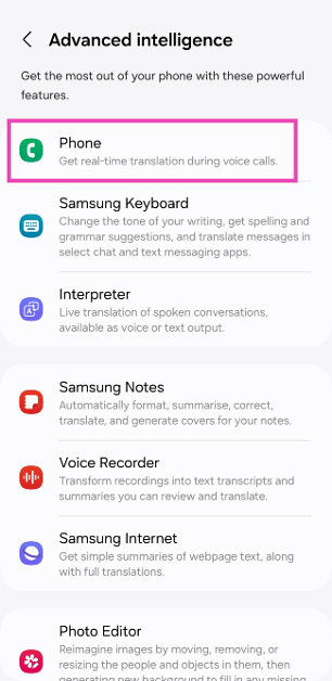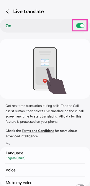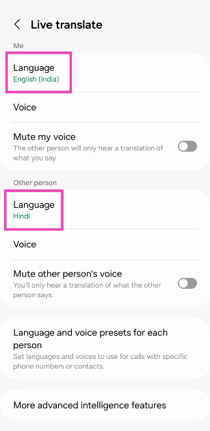 Mennä jhkAsetukset> Advanced Ominaisuudet> Advanced Intelligence> Puhelinja kytke kytkinkytkin päälle live -kääntämistä varten. Vieritä alas ja valitse kohdekielet sinulle ja soittajalle. Soita nyt ja lyöCall Assist> Live -käännös.