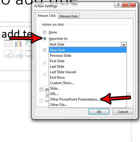 Vaihe 7: ValitseHyperlinkki kohteeseenvaihtoehto ja valitse sittenMuu Powerpoint-esitysluettelosta.