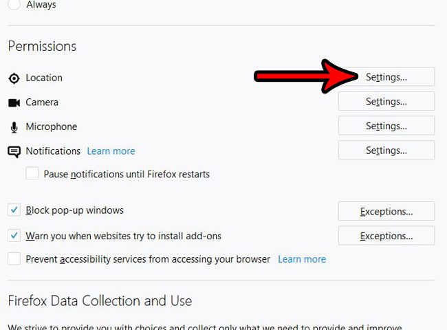 Mutta jos et halua jakaa näitä tietoja minkään sivuston kanssa, saatat etsiä tapaa estää jatkuvat pyynnöt, jotka tulevat sivustoilta, jotka haluavat käyttää sijaintiasi. Alla oleva opetusohjelma näyttää, kuinka voit estää verkkosivustoja pyytämästä sijaintiasi Firefoxissa, jotta sinun ei enää tarvitse hylätä näitä ilmoituksia.
