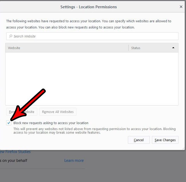 Vaihe 6: Valitse ruudun vasemmalla puolella oleva valintaruutuEstä uudet pyynnöt, joissa pyydetään pääsyä sijaintiisija napsauta sittenTallenna muutokset-painiketta.