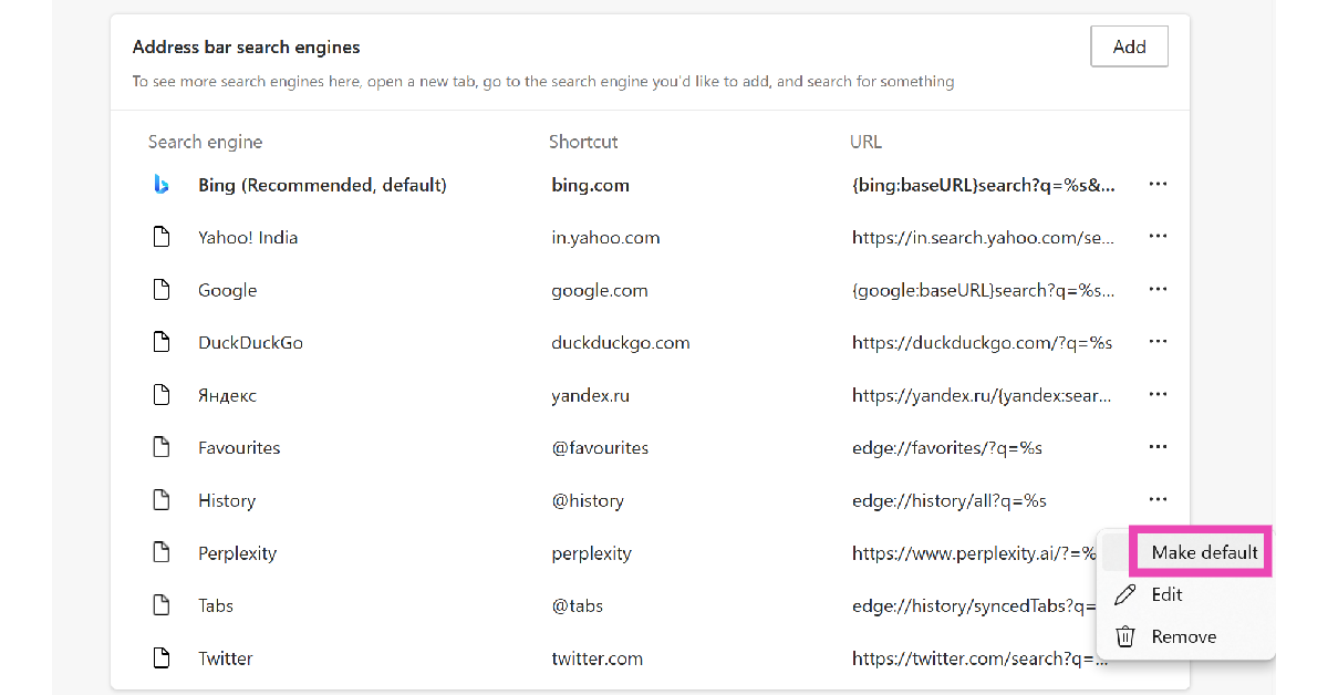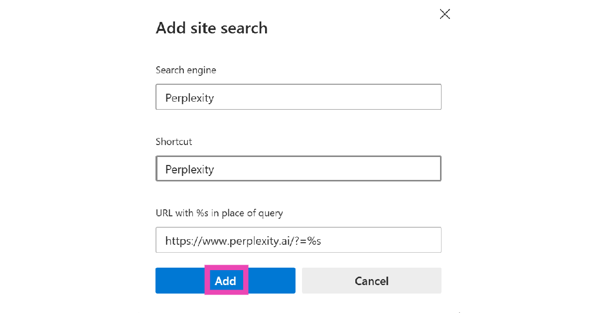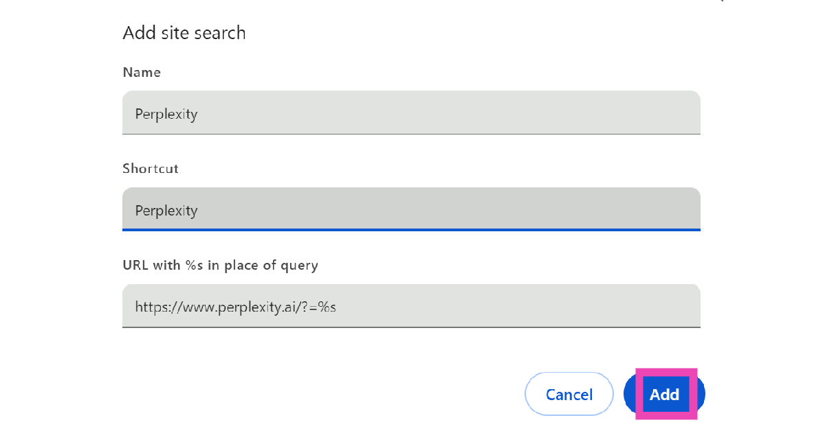 Vaihe 5:SiinäURL -osoiteTekstilaatikko, kirjoita https://www.perplexity.ai/?q=%S.