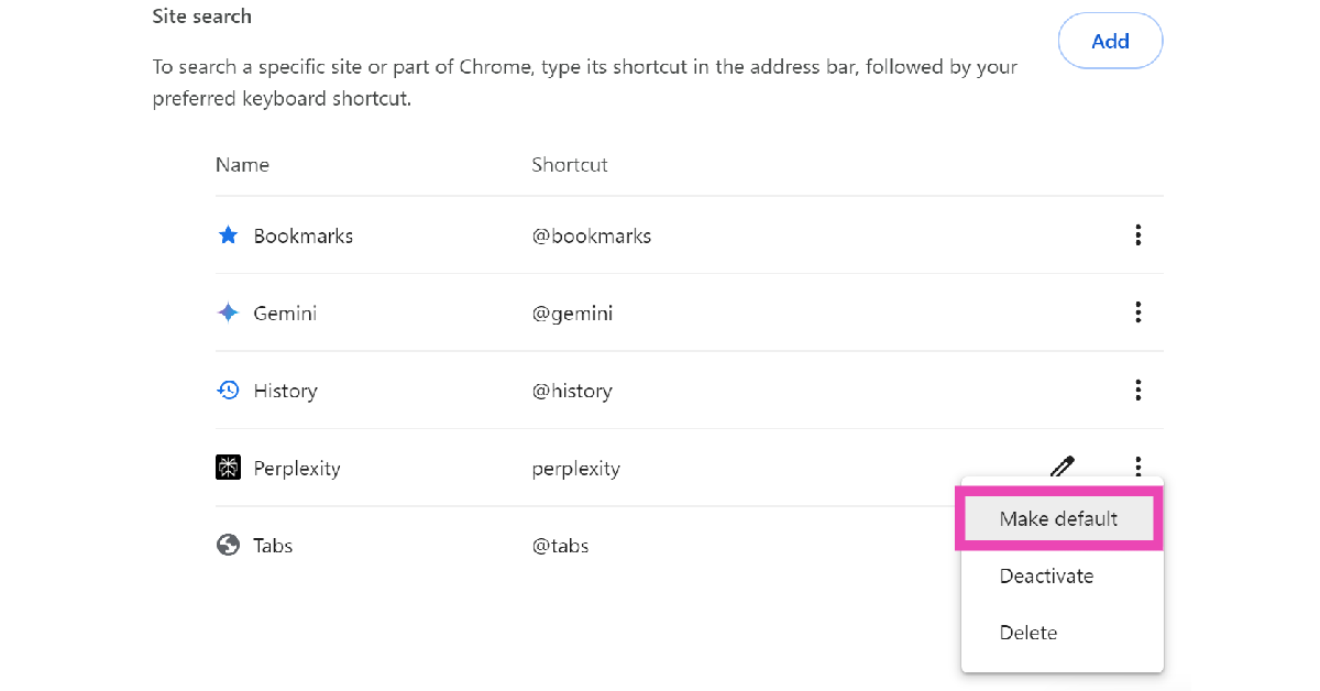 Voit asettaa hämmentyneen AI: n oletushakukoneena Google Chromessa siirtymällä kohtaan SEttings> Hakukone> Hallitse hakukoneita ja sivuston haku> Lisää, ja syötetään https://www.perplexity.ai/?q=%S.