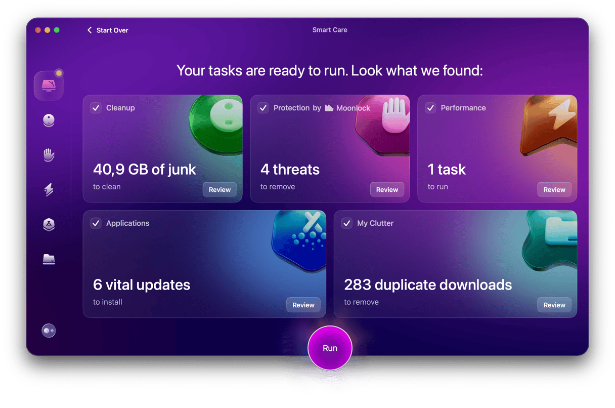 On kuitenkin olemassa nopeampi ja tehokkaampi vaihtoehto – CleanMyMac ja sen Smart Care -ominaisuus. Se skannaa Macisi ja etsii päällekkäisiä latauksia muun muassa. Avaa sovellus ja napsauta Skannaa > Suorita.