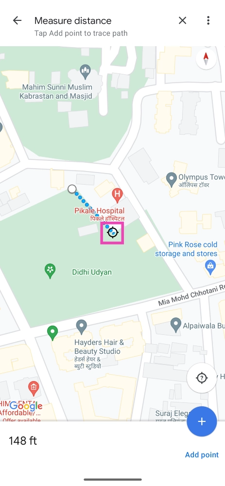 Napauta ja pidä pudottaaksesi nastaan pisteeseen A ja vedä karttaa, kunnes saavut pisteeseen B. Sovellus näyttää kahden pisteen välisen etäisyyden.