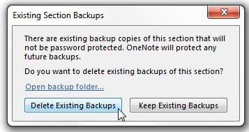 OneNote kysyy sitten, kuinka haluat, että se käsittelee olemassa olevia varmuuskopioita, joissa on kopio kannettavasta osiosta ilman salasanasuojaa, joten valitse haluamasi vaihtoehto.