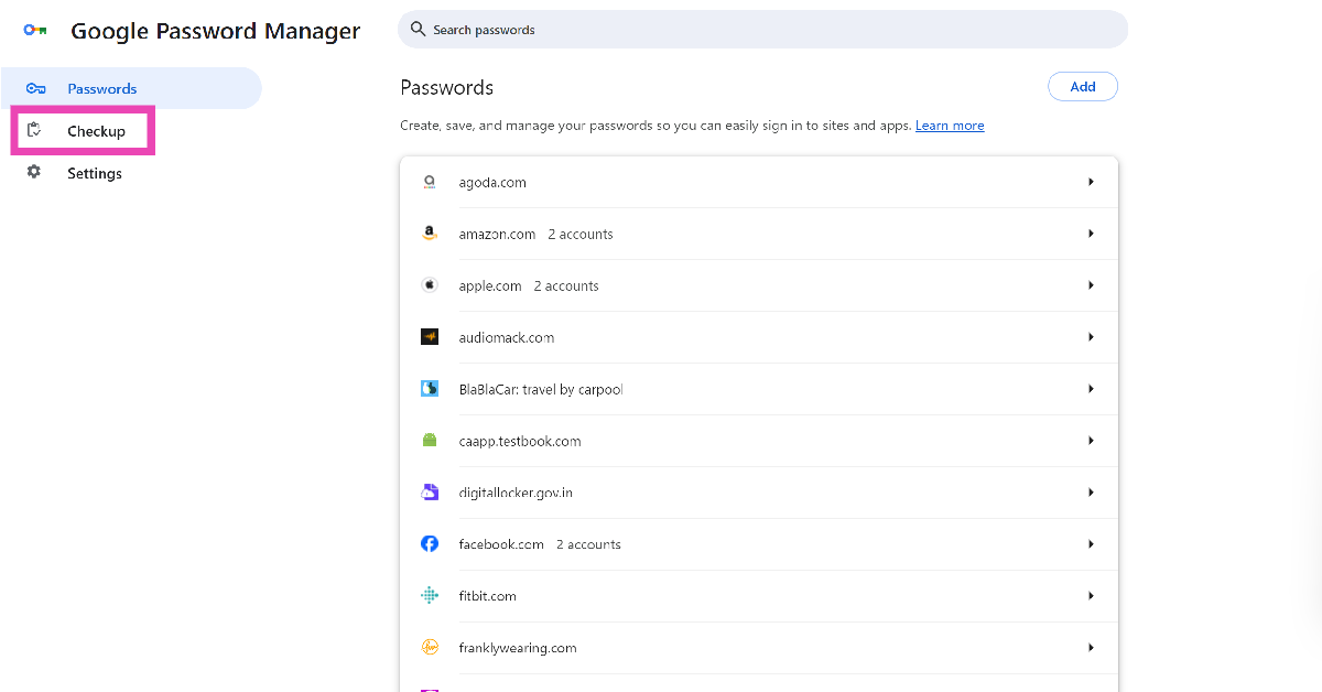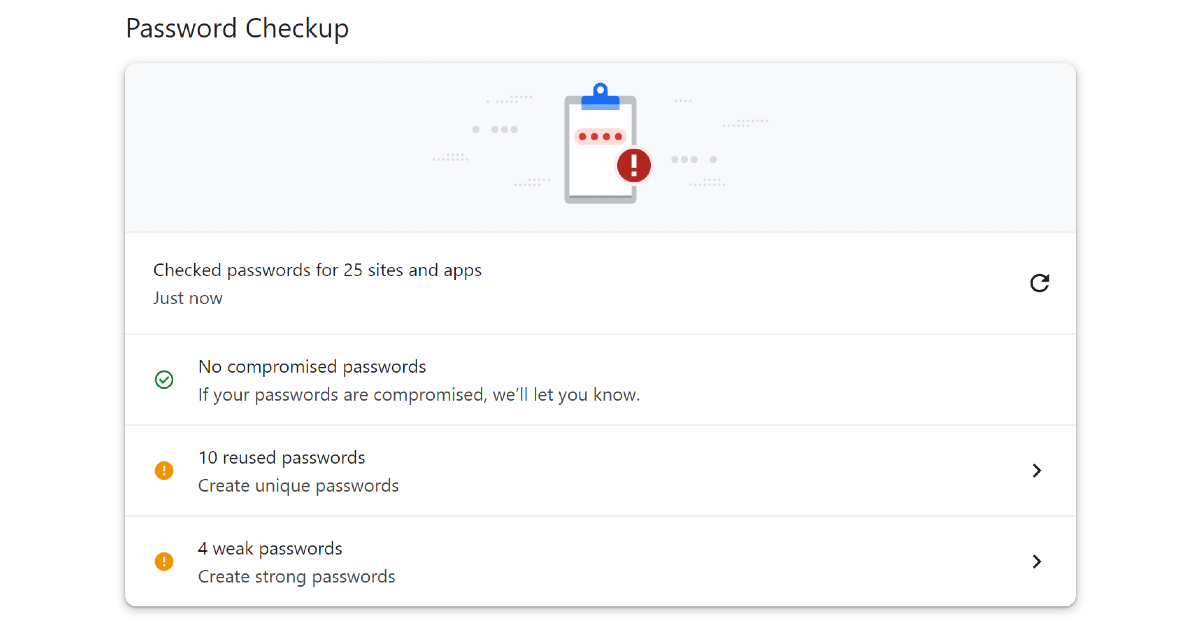Vaihe 5:Google -salasananhallinta aloittaa automaattisesti tarkistuksenVaaranneet salasanat. Lisäksi se ilmoittaa sinulle salasanoista, jotka ovatheikkotaiuudelleenkäytetty.