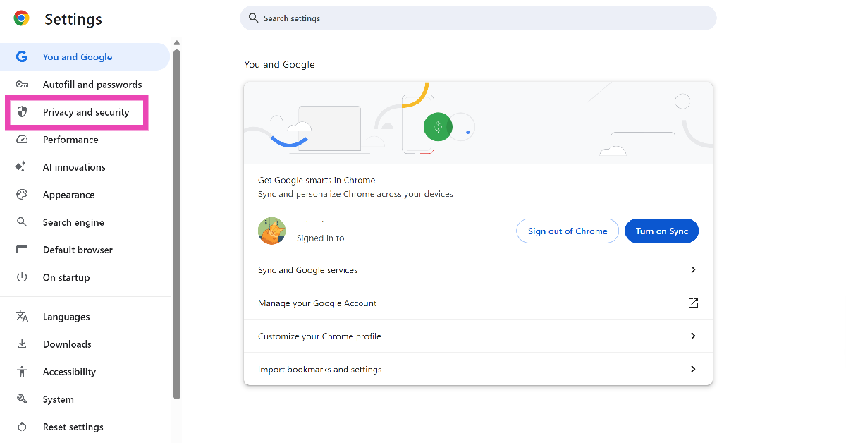 Vaihe 2:ValitaYksityisyys ja turvallisuussivupalkista.