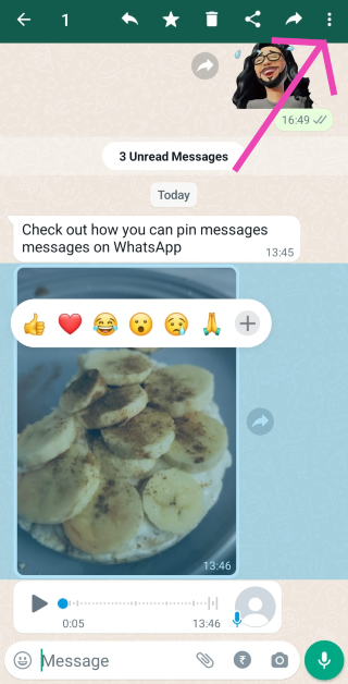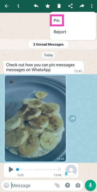 WhatsApp antaa sinun kiinnittää enintään 3 viestiä chattiin. Tämä voi sisältää tekstejä, kuvia, linkkejä, äänihuomautuksia ja kyselyjä.