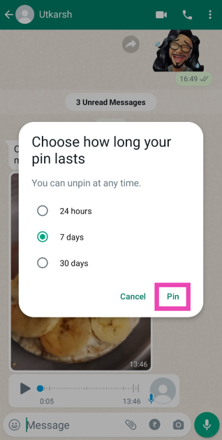 Ei, WhatsApp antaa sinun kiinnittää viestin 24 tunnin, 7 päivän tai 30 päivän ajan.