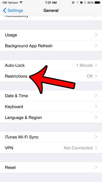 - Vaihe 3: Vieritä alas ja valitseRajoituksetvaihtoehto.