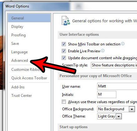 Vaihe 3: NapsautaEdistynytvälilehti vasemmassa sarakkeessaWord -asetuksetikkuna.