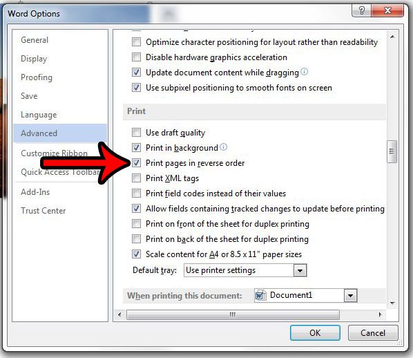 Onneksi Word 2013 -sovelluksessa on asetus, jonka avulla voit tulostaa viimeisen sivun ensin, mikä voi säästää sinun tarvitsevan korjata tulostetun asiakirjan järjestyksen manuaalisesti.
