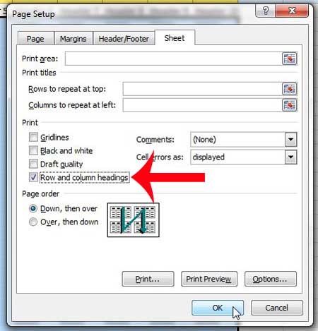 Vaihe 5: Valitse vasemmalla puolella oleva ruutuRivi- ja sarakkeetsiinäPainaaNapsauta sitten ikkunasta ja napsauta sittenHyväPainike ikkunan alareunassa vahvistaaksesi muutokset.