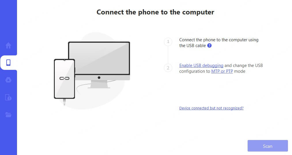 Vaihe 3Kytke Android -laite tietokoneeseen USB -kaapelilla. Samaan aikaan,Ota USB -virheenkorjaus käyttöönja vaihda USB -kokoonpanoMTP tai PTPtila.