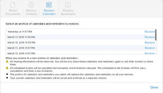 Vaihe 2:Paina “Asetukset” -sovellusta, napsauta “Advanced” -vaihtoehtoa ja valitse “Palauta kalenterit ja muistutukset”.