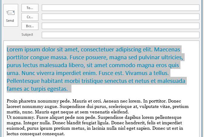 Vaihe 2: Korosta hiirellä sähköposti -rungossa olevaa tekstiä, jolle haluat tyhjentää muotoilun. Jos haluat valita koko viestin rungon, napsauta sitten jossain sähköpostin sisällä ja paina sittenCtrl + anäppäimistöllä.