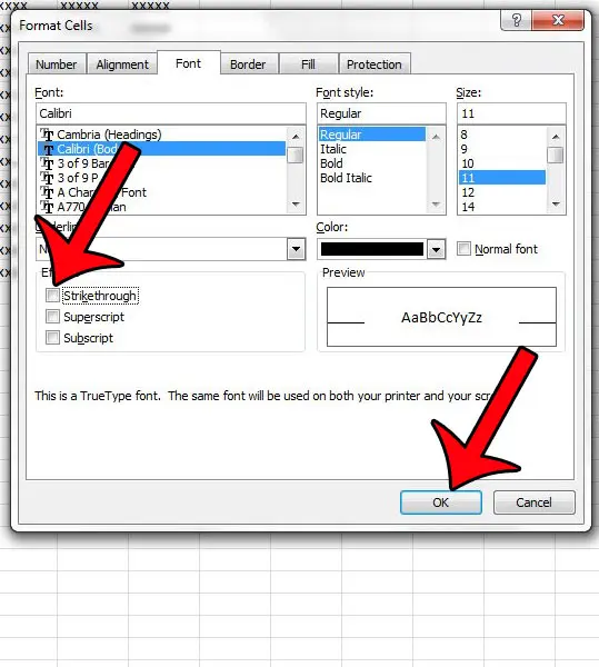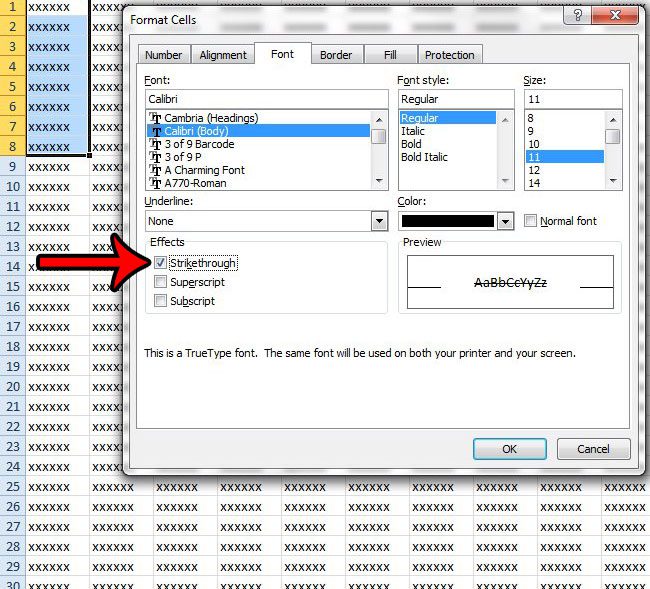 Vaihe 4: Valitse ruudun vasemmalla puolella oleva valintaruutuYliviivattuja napsauta sittenOK-painiketta ikkunan alareunassa.