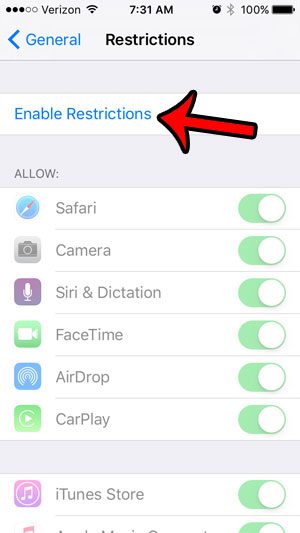 Vaihe 4: Napauta sinistäOttaa käyttöön rajoituksetPainike näytön yläosassa.