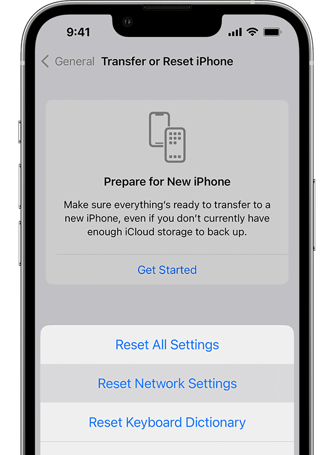 Jos kyseessä on iPhone 13 ja 14, siirry kohtaan Asetukset, valitse Yleiset, napauta Siirrä tai Palauta iPhone, valitse Nollaa ja valitse sitten Nollaa verkkoasetukset. Vahvista salasanasi jatkaaksesi nollausta.