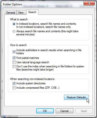 Onneksi voitPalauta oletushakemat Windows 7: ssäNäiden ongelmallisten toimintojen estämiseksi ja palaamiseksi tilaan, jossa hakuominaisuus on kevyt ja hyödyllinen, vaikkakin vähemmän perusteellinen.