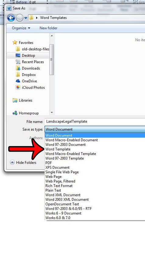 Vaihe 5: Napsauta avattava valikko oikealla puolellaTallenna tyyppi, napsauta sittenSanamuotovaihtoehto.
