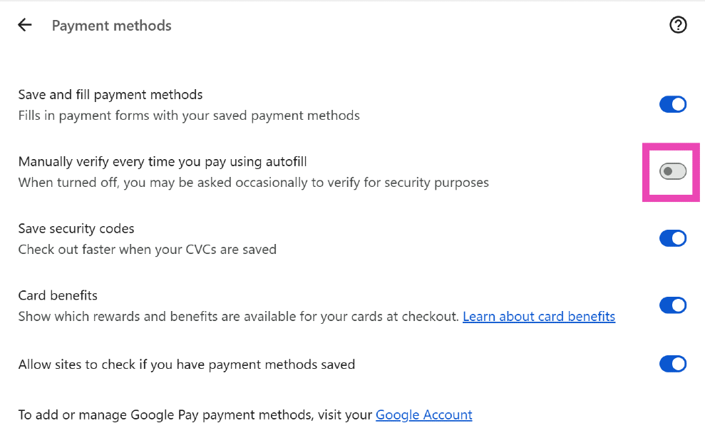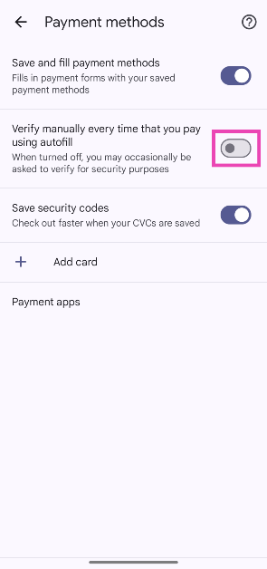 Siirry osoitteeseenAsetukset> Automaattinen täyttö ja salasanat> Maksutavatja laita vaihtokytkin päälle "Vahvista manuaalisesti aina, kun maksat käyttämällä automaattista täyttöä" -kohdan vieressä.