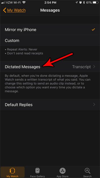 Tämän artikkelin vaiheet suoritettiin Apple Watchilla WatchOS 4.2.3: n avulla. Tämä muuttaa kellon käyttäytymistä niin, että se lähettää sanelut viestejäsi äänileikkeeksi sen sijaan, mitä puhuit kelloon.