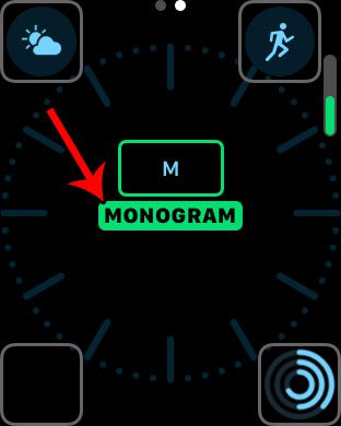 Vaihe 7: Napauta ruudua näytön keskellä ja käännä sitten kellon sivulla oleva valitsinta, kunnes monogrammi tulee näkyviin. Voit sitten poistua mukauttamisnäytöstä painamalla kruunupainiketta.