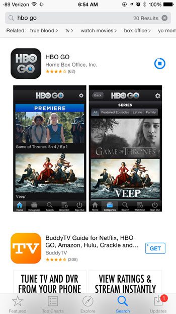 HBO Go for iPhone tarjotaan ilmaisena ladattavana sovelluksena. Sovelluksen lataamiseksi ja asentamiseksi sinun on tiedettävä Apple ID -salasana iPhonelle, jolla haluat ladata sovelluksen.